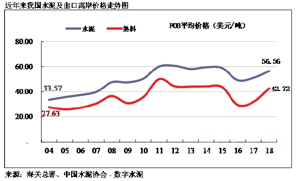 自2006年水泥出口達(dá)到高峰的3,612萬噸以后,我國水泥出口量呈明顯逐年下降趨勢(shì),主要原因:一是我國出口政策的調(diào)整,2007年國家取消了11%出口退稅的優(yōu)惠政策。二是國際市場(chǎng)需求疲軟,水泥需求缺口縮小,尤其是原來我國出口大戶美國房地產(chǎn)業(yè)投資大幅下滑,導(dǎo)致其進(jìn)口水泥大幅度縮減。2018年出口量?jī)H為904萬噸,這是自2005年以來首次跌破1000萬噸,但出口的FOB價(jià)格連續(xù)三年回升,2018年達(dá)到56.6美金。